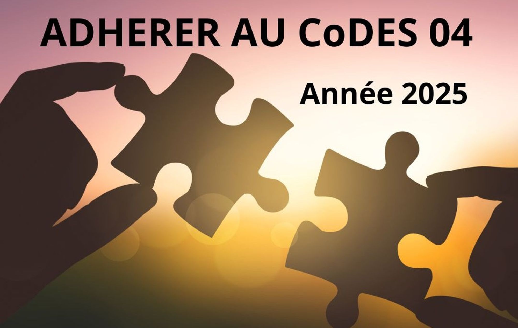 L’adhésion au CoDES 04 soit : 25 € pour les particuliers et 45 € pour les structures (bulletin d’adhésion en ligne) à compléter. A réception une facture vous sera adressée afin d'effectuer le virement.