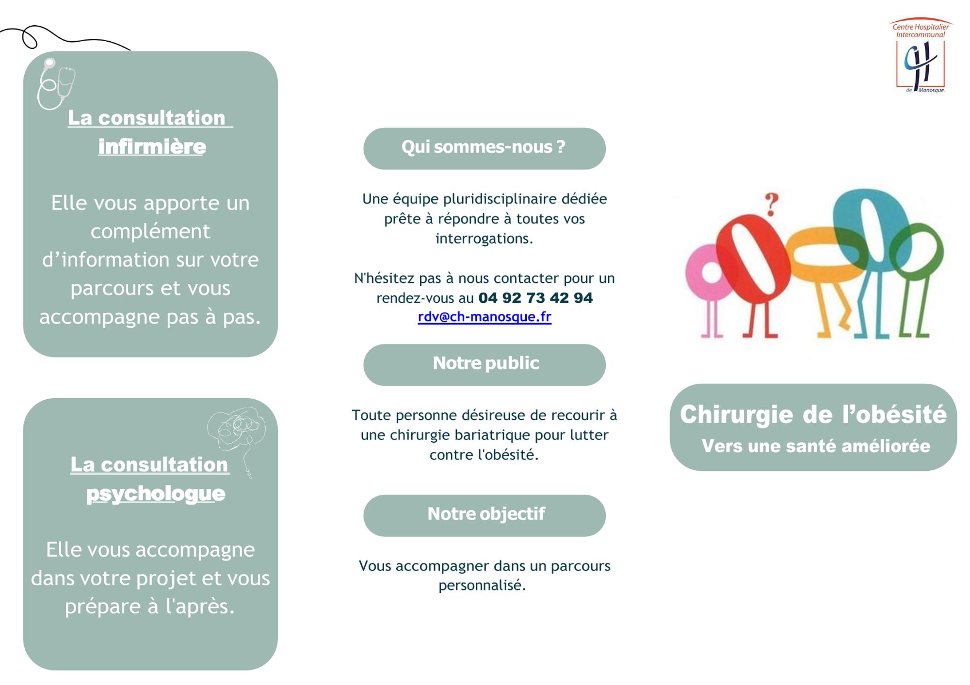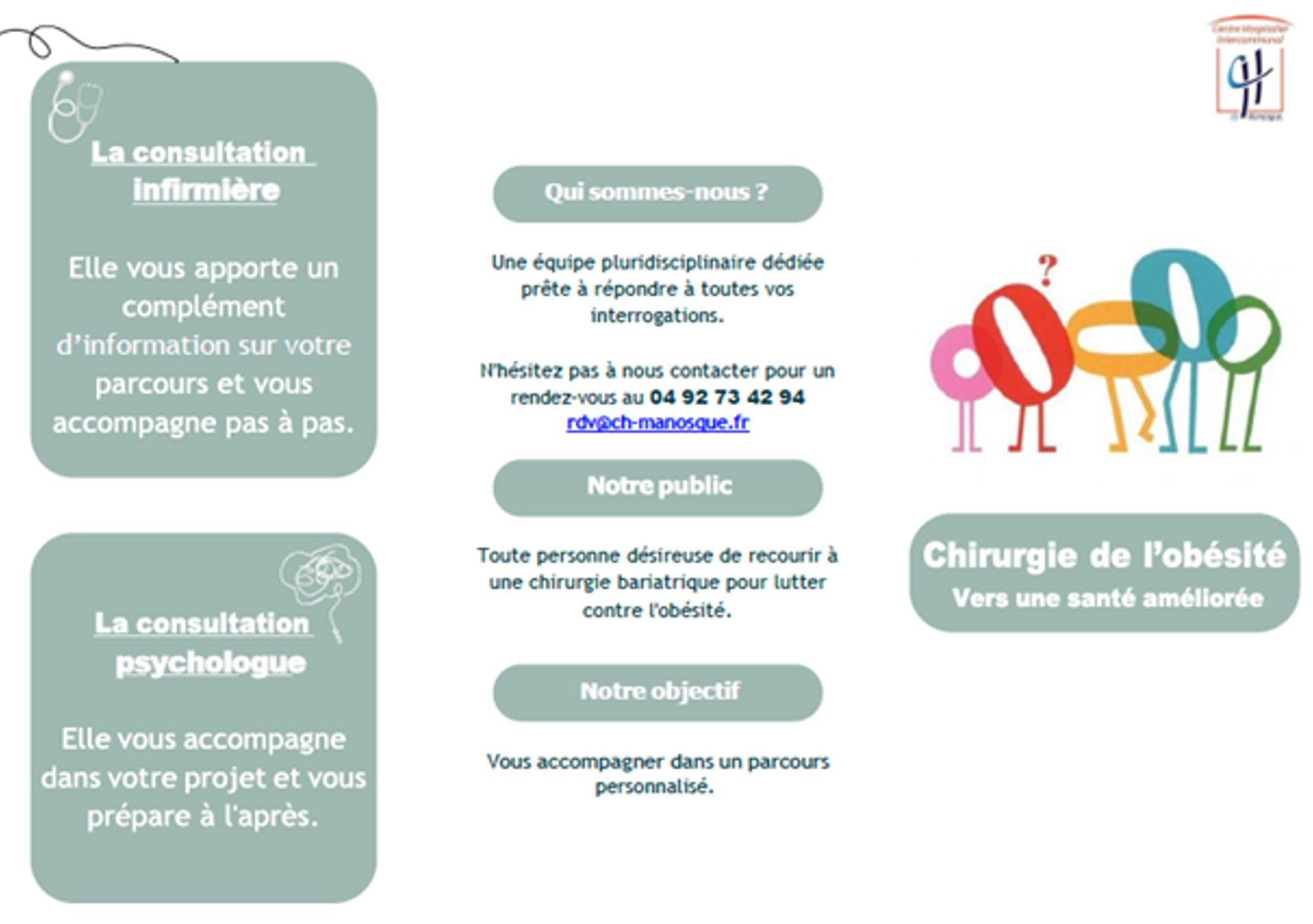 Chirurgie de l'obésité - Vers une santé améliorée Contact pour plus de renseignements : 0492734294 rdv@ch-manosque.fr Flyers 3 volets VF (2).pdf (254.7 Ko)