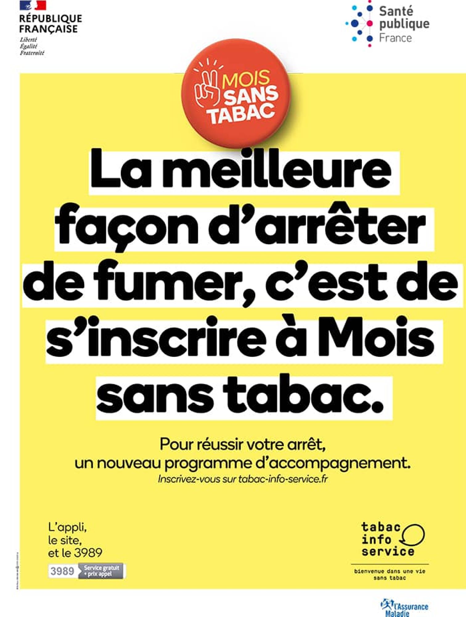 Mois sans tabac est une campagne nationale mise en place depuis 2016 et reconduite depuis chaque année. Cette opération de marketing social a été lancée en 2016 à l'initiative de Santé publique France et du ministère de la Santé, en partenariat avec l'Assurance maladie. Elle s’inscrit dans le cadre du programme national de lutte contre le tabagisme, avec pour objectifs l’incitation et le soutien à l’arrêt pendant un mois via une campagne de communication, la mise en avant d’outils d’aide à l’arrêt via Tabac info service et la mobilisation des acteurs par la mise en place d’actions directement auprès de leur public.