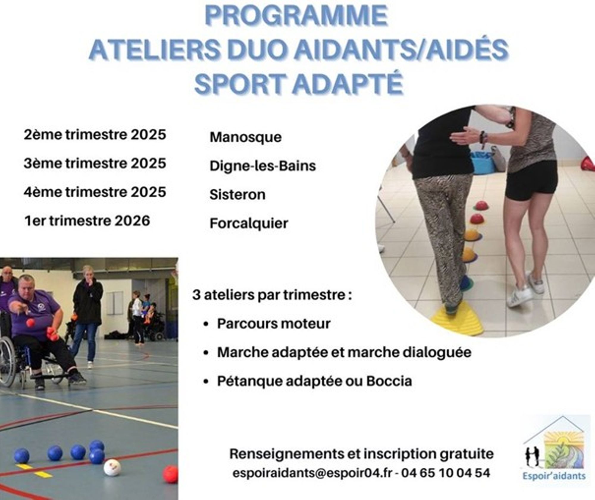 Espoir’aidants met en place des ateliers sport adapté duo aidants/aidés. Ces ateliers se dérouleront mensuellement, sur différentes villes du département.