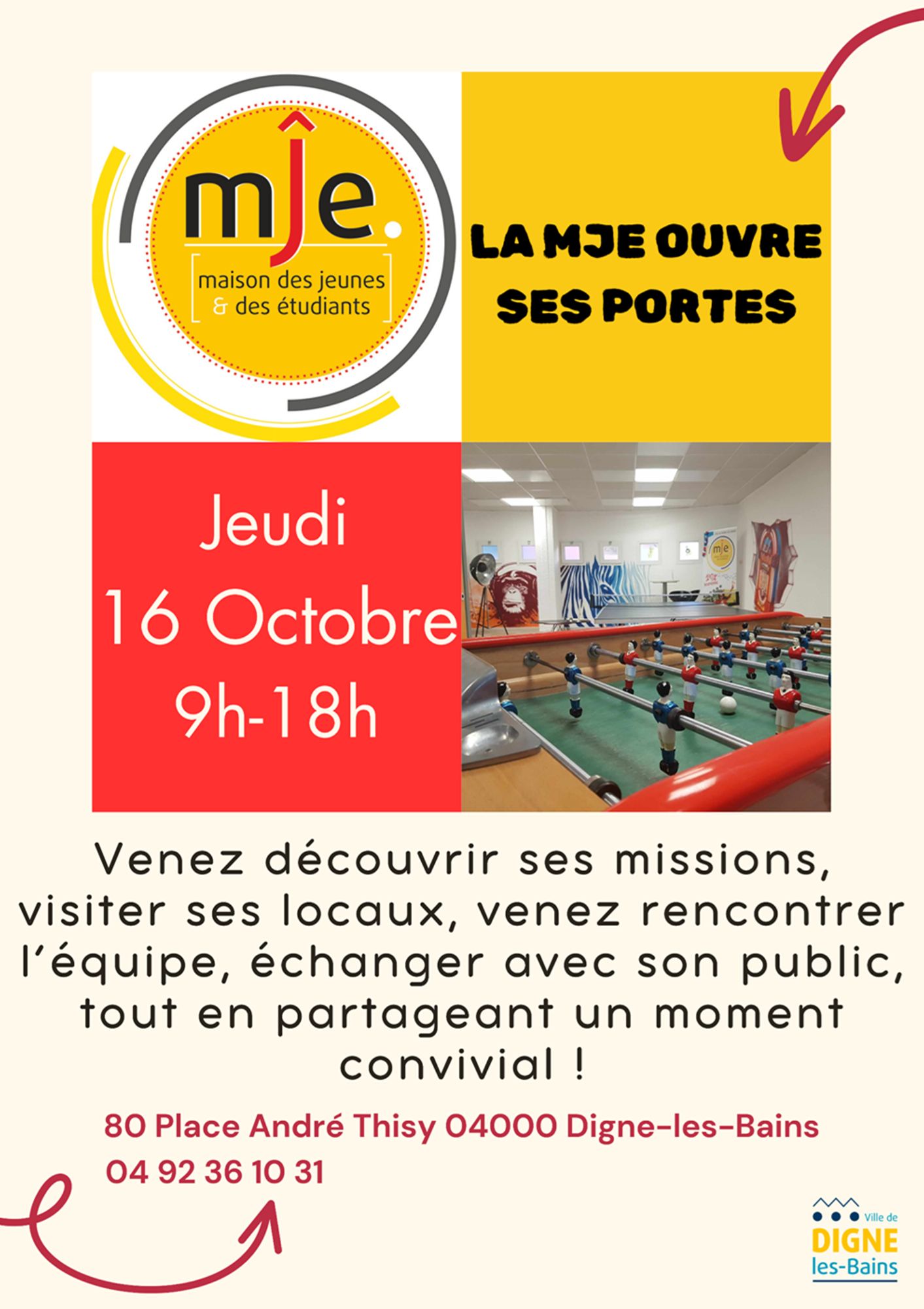 Portes Ouvertes MJE (Maison des Jeunes et des Etudiants) Jeudi 16 octobre 2025 de 9h à 18h à Digne les Bains Pour plus de renseignements, contacter la MJE : 80 Place André Thisy 04000 DIGNE LES BAINS 04 92 36 10 31