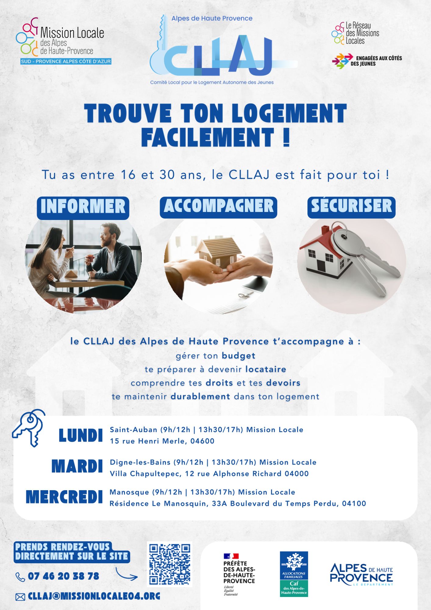 Trouve ton logement facilement ! Tu as entre 16 et 30 ans, le CLLAJ est fait pour toi ! Pour plus de renseignements 07 46 20 38 78 CLLAJ@MISSIONLOCALE04.ORG Affiche à télécharger (1.9 Mo)