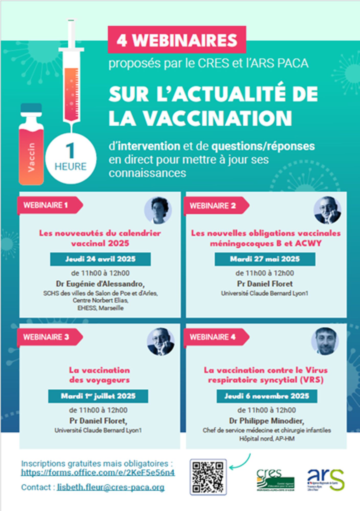 - Les nouvelles obligations vaccinales méningocoques B et ACWY, Pr Daniel Floret, le mardi 27 mai 2025, de 11h à 12h