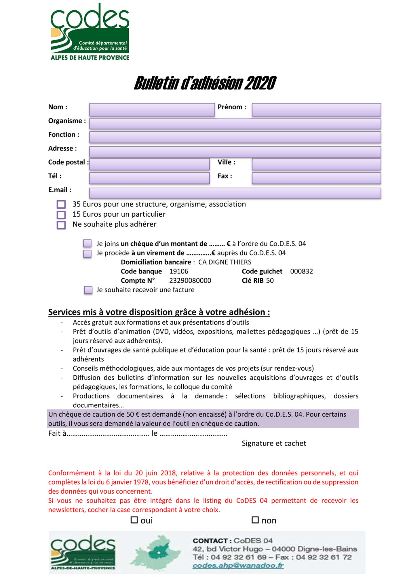 L'année 2020 vient de commencer, nous vous invitons à renouveler votre adhésion afin de continuer à bénéficier des services du Co.D.E.S. 04 (si cela n'est pas déjà fait).