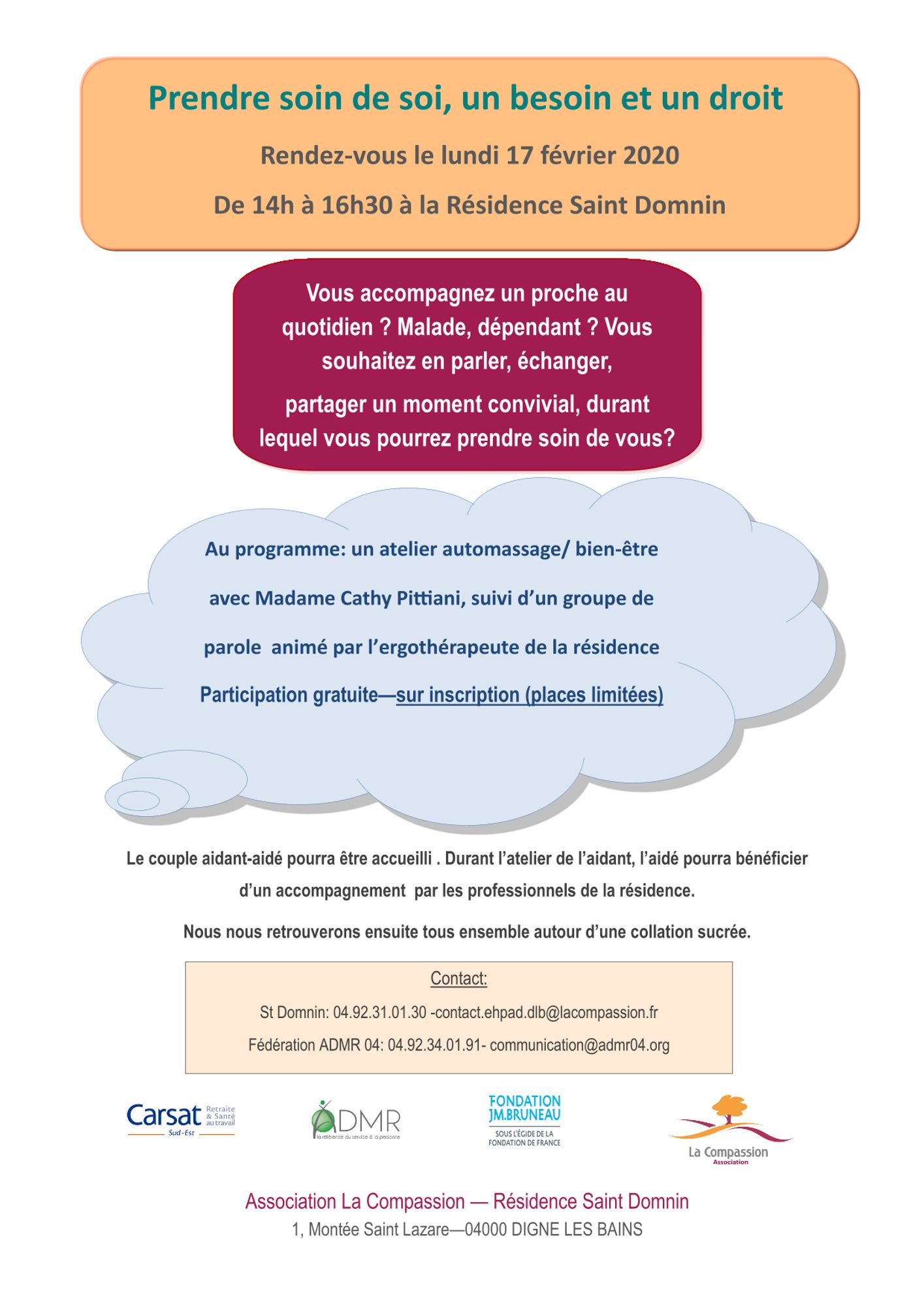 L'EHPAD Saint Domnin organise en partenariat avec l’ADMR un café/ atelier bien-être à destination des aidants le 17 février prochain.