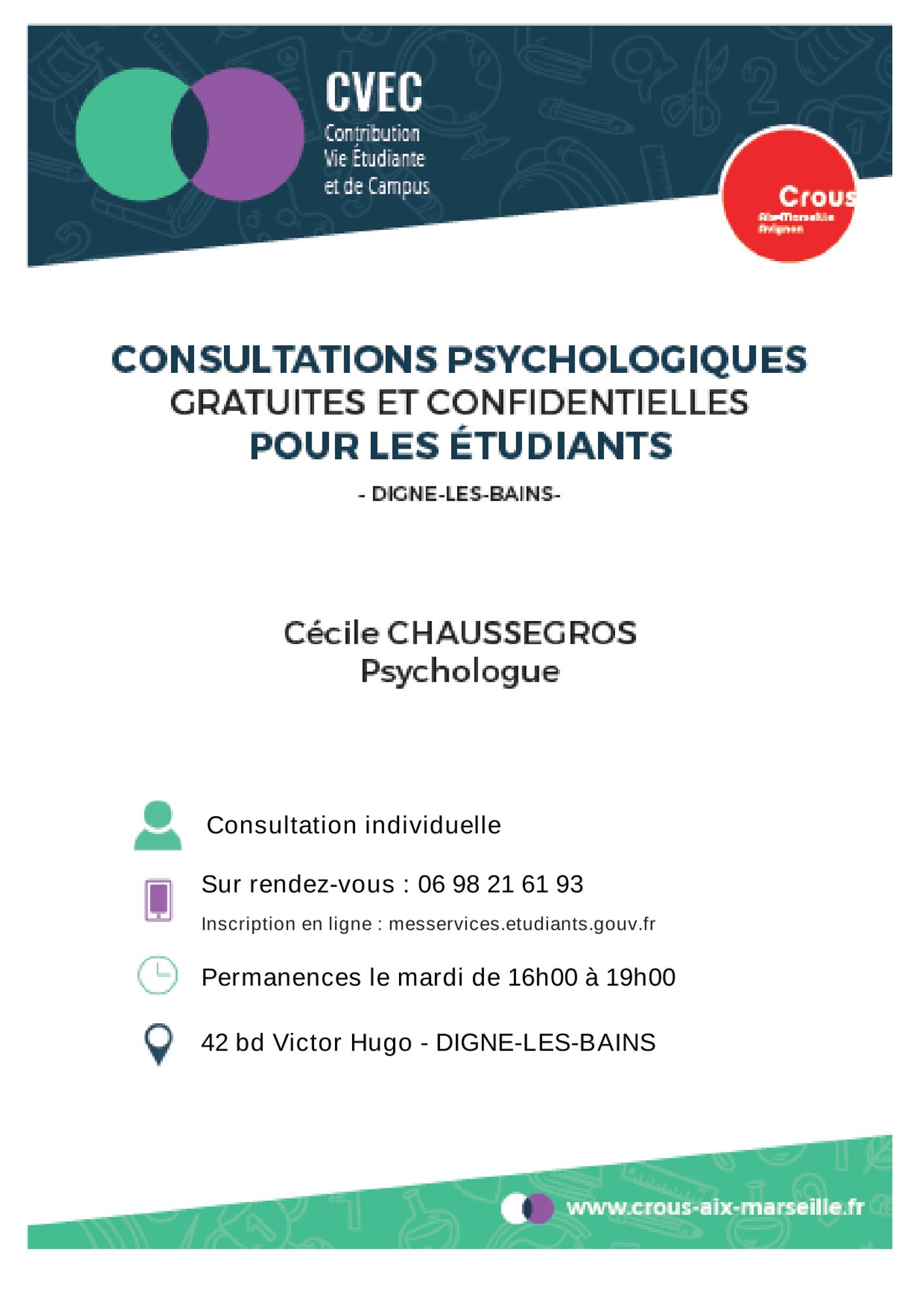 Nous vous rappelons que dans le cadre de la convention signée avec le CROUS Aix Marseille, le Co.D.E.S. 04 accueille dans ses locaux une psychologue tous les mardis de 16h à 19h sur rendez-vous.