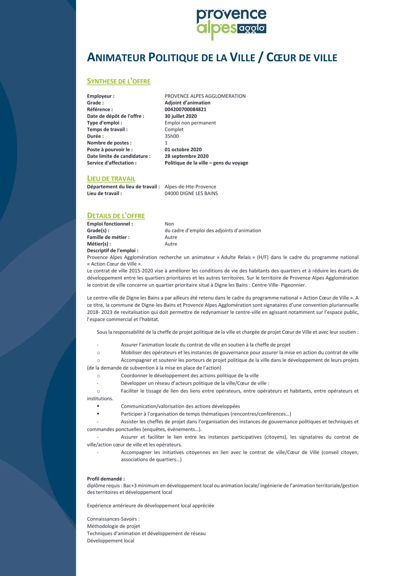 Poste à pouvoir - Animateur politique de la ville / Coeur de Ville à Digne les Bains
