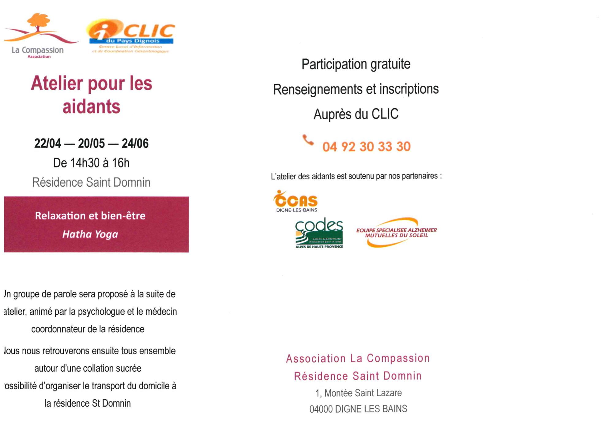 Pour plus de renseignements, merci de contacter le CLIC au 04 92 30 33 30