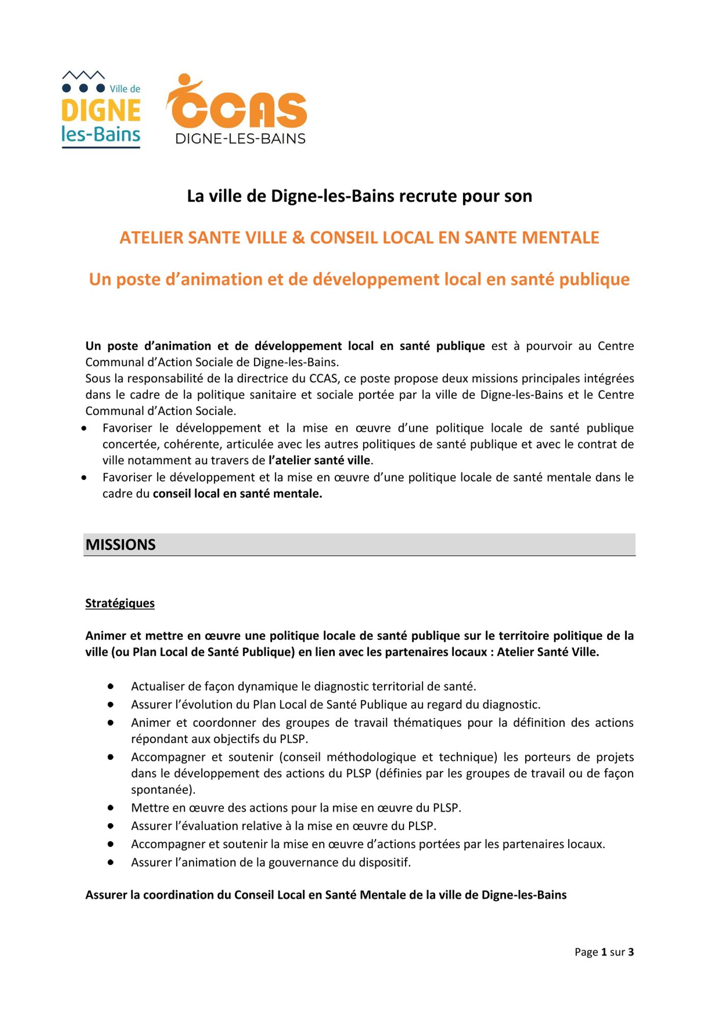 Sous la responsabilité de la directrice du CCAS, ce poste propose deux missions principales intégrées dans le cadre de la politique sanitaire et sociale portée par la ville de Digne-les-Bains et le Centre Communal d’Action Sociale.