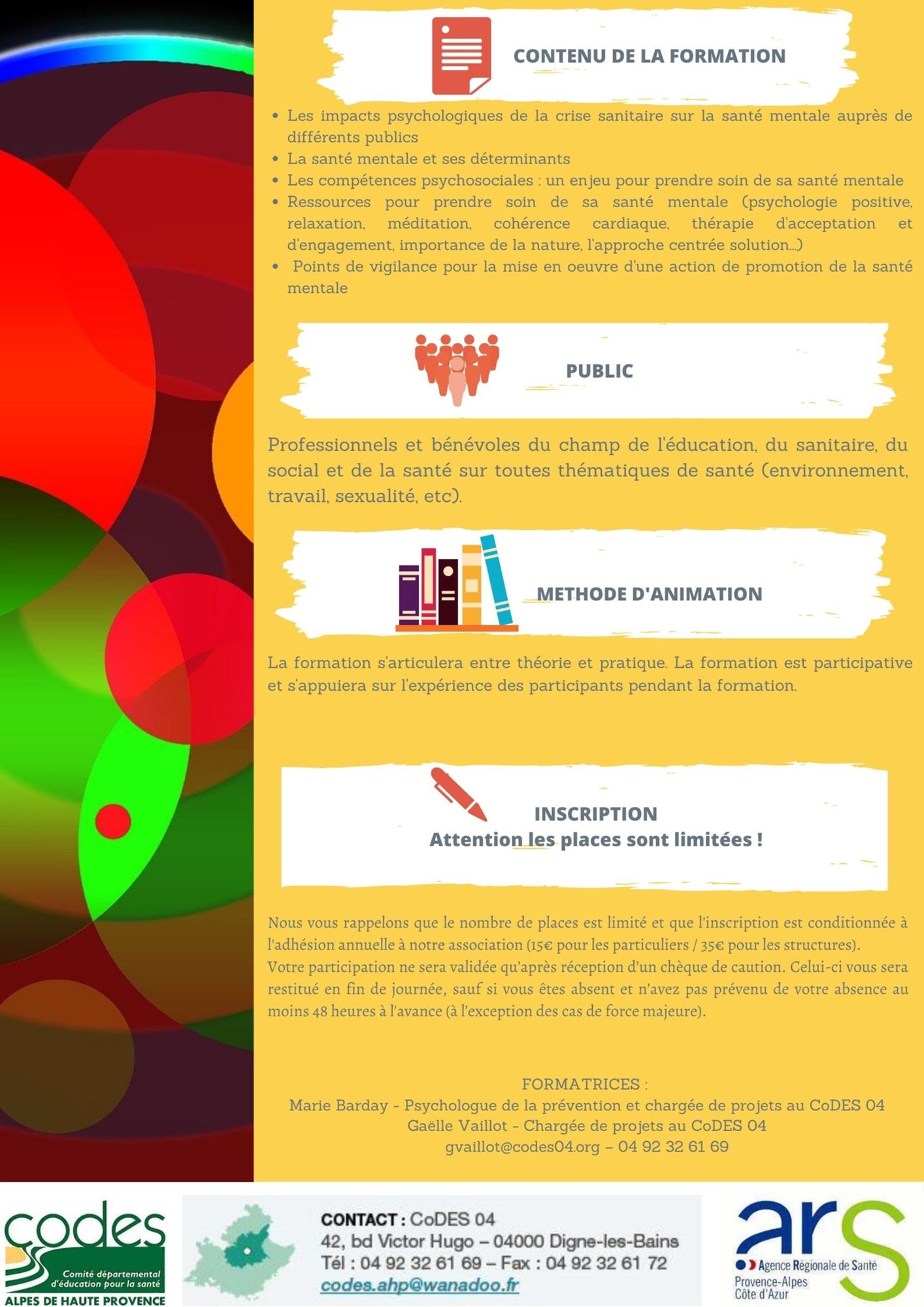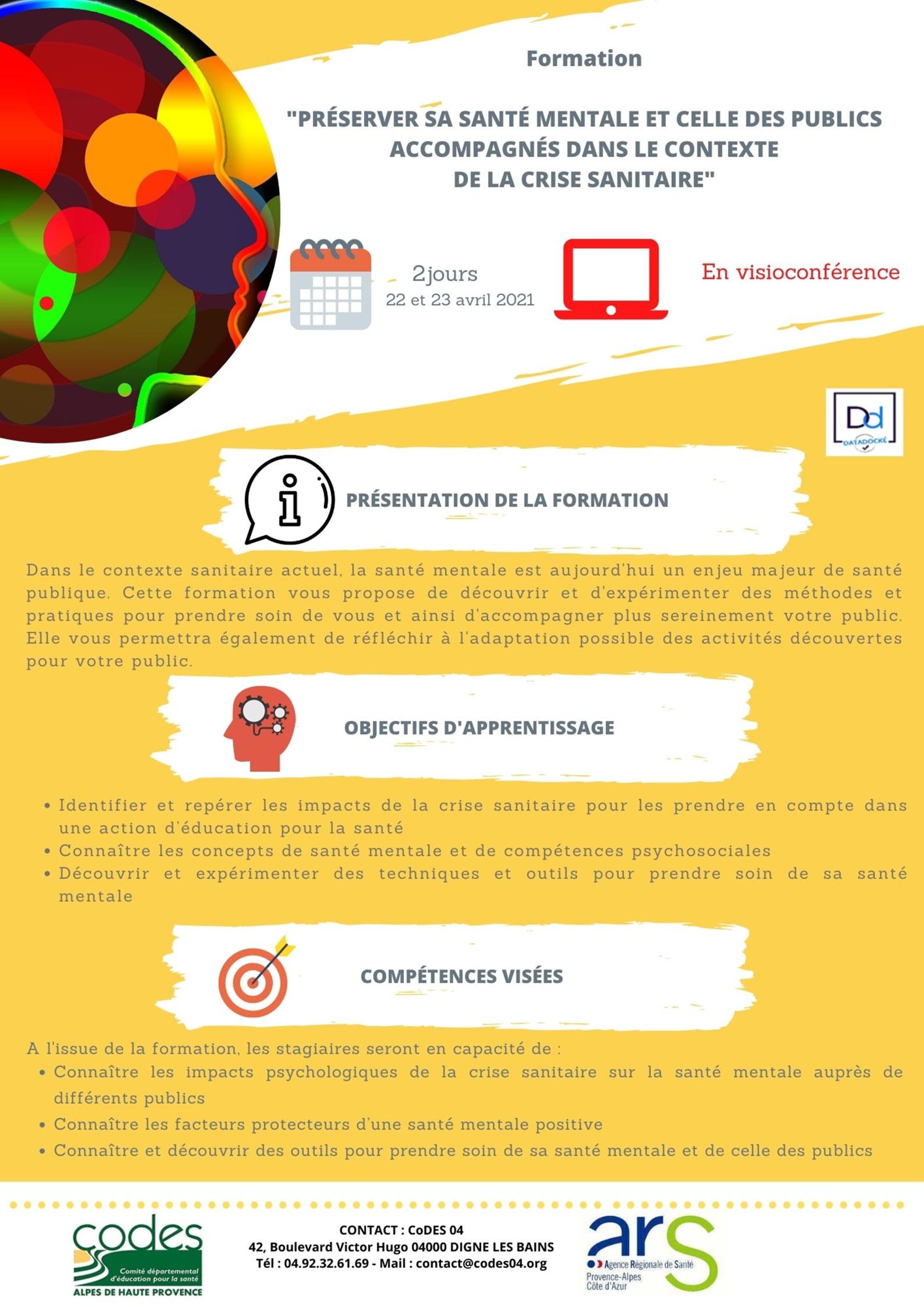 FORMATION EN LIGNE : Préserver sa santé mentale et celle des publics accompagnés dans le contexte de la crise sanitaire Le 22 et 23 avril 2021 Dernière modification : 8 juin 2021 Inscription à la formation en ligne