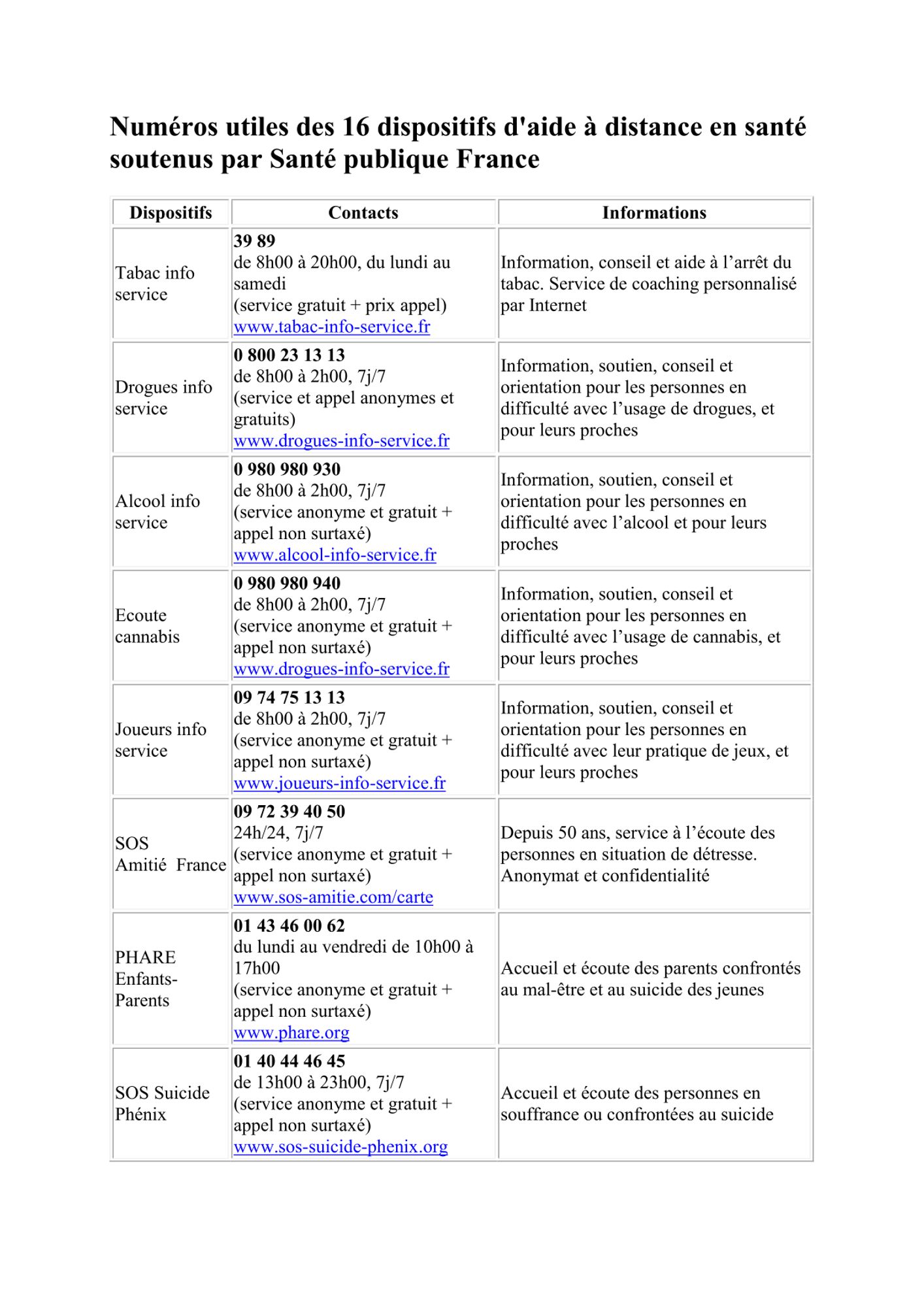 Acteur majeur de la téléphonie santé depuis 2003, Santé publique France finance 16 dispositifs d’aide à distance associant des lignes téléphoniques et des sites Internet (Tabac Info Service, Drogues Info Service, Fil Santé Jeunes, Sida Info Service, etc.). Ce sont des moyens de prévention très importants, au contact direct des Français. À partir de 2003, Santé publique France s’est vue confier par les pouvoirs publics le pilotage d’une partie des services de téléphonie santé encore appelés services de prévention et d’aide à distance en santé (PADS) puisqu’ils associent des lignes téléphoniques et des sites internet. Ces dispositifs portent sur des champs variés en matière de prévention :