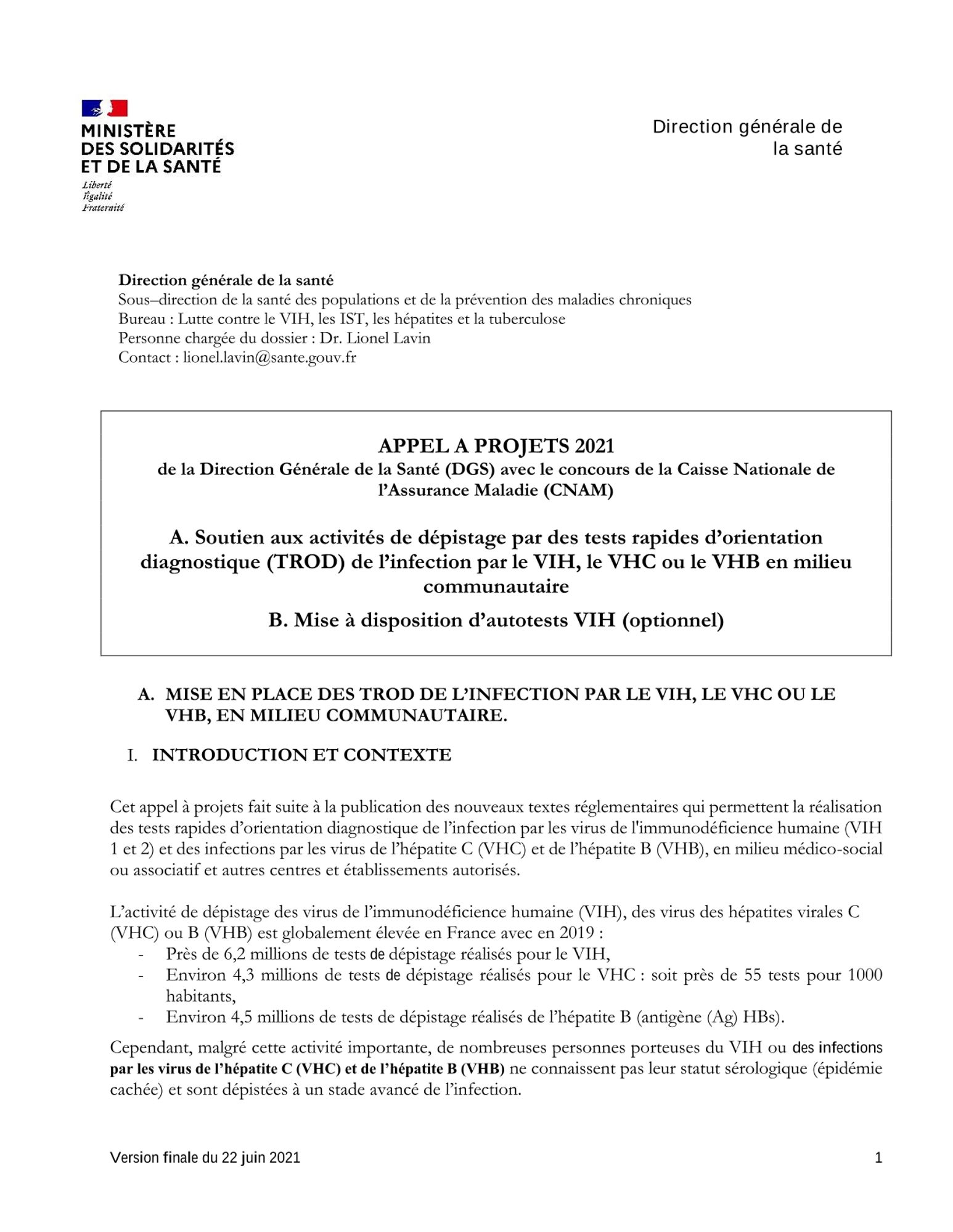 Le ministère des solidarités et de la santé, en lien avec la Caisse nationale de l’assurance maladie a lancé le 22 juin 2021 un appel à projets visant à soutenir l’activité de dépistage rapide par TROD VIH, TROD VHC, TROD VHB et par autotest VIH réalisée par les associations au plus près des populations les plus exposées au risque.