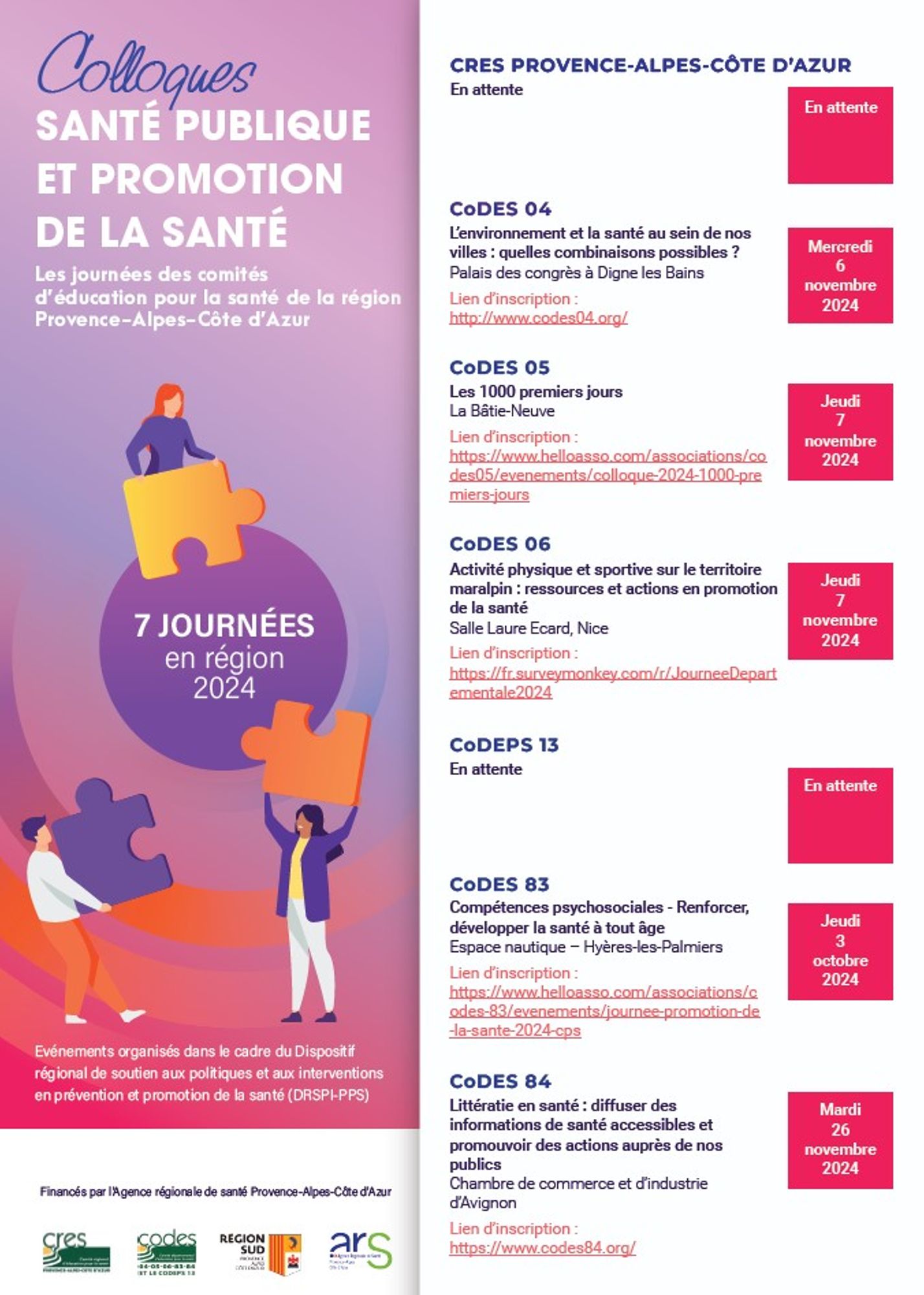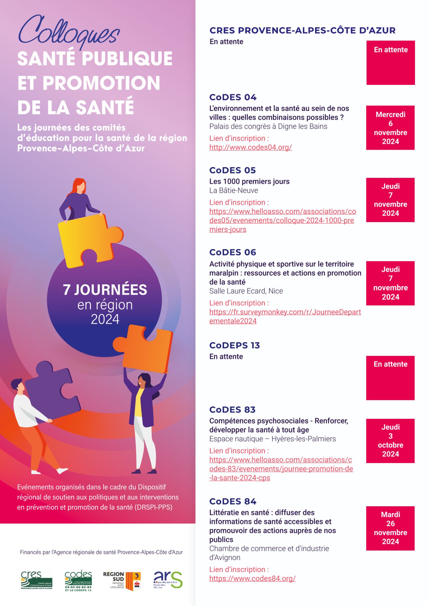 Colloque Santé Publique et Promotion de la Santé Les journées des comités d'éducation pour la santé de la région Provence-Alpes-Côte d'Azur Consulter et imprimer le document : Flyer_CSP_2024_V6.pdf (3.3 Mo)