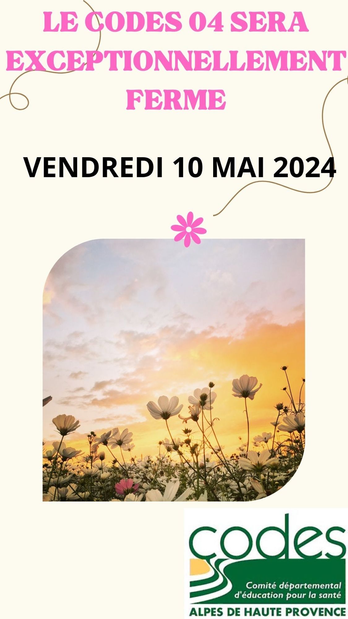 Fermeture exceptionnelle du Co.D.E.S. 04 Vendredi 10 Mai 2024 Fermeture Co.D.E.S. pont 10 mai 2024.pdf (689.2 Ko)