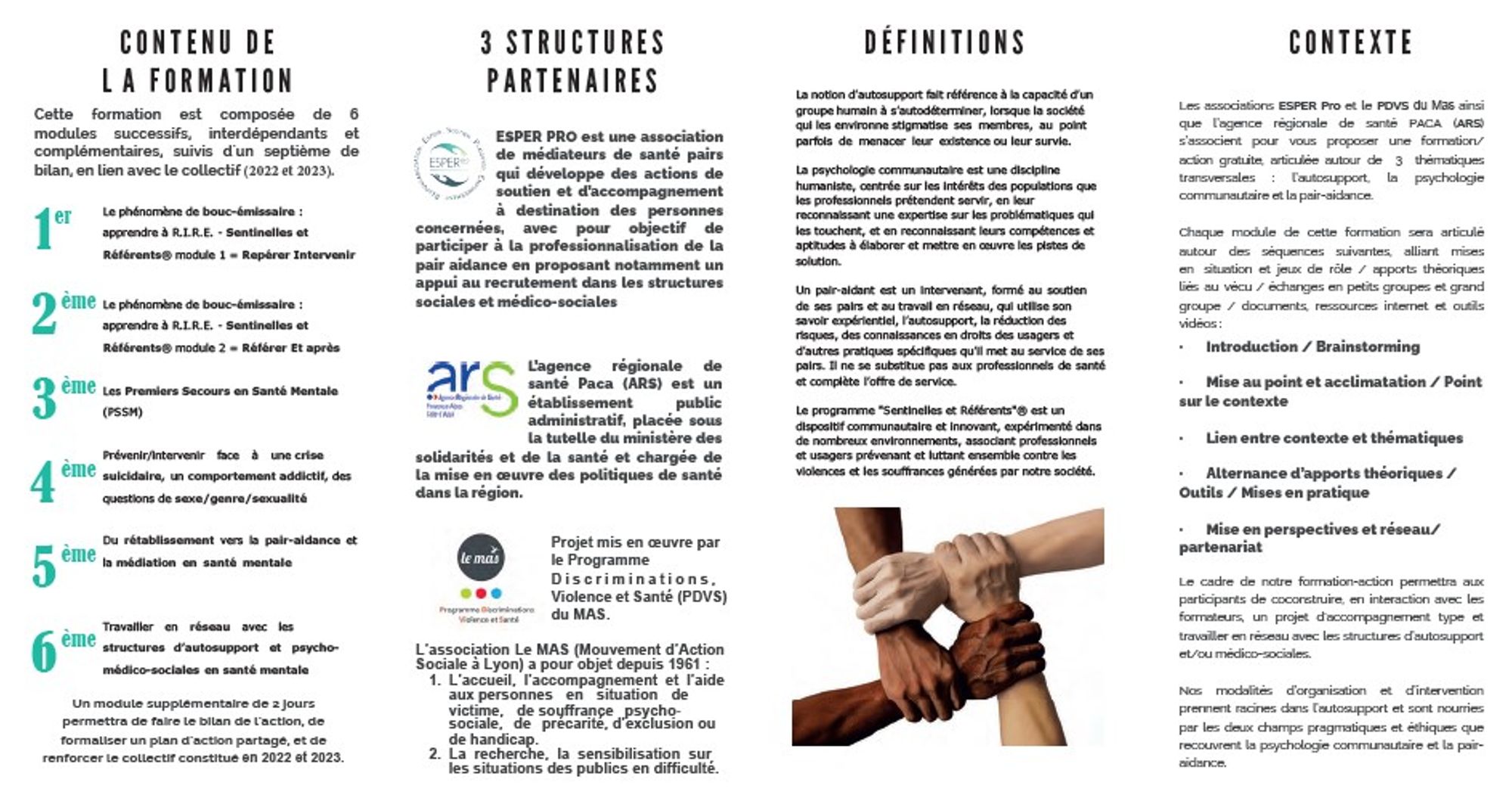 Formation "Sentinelles et référents® en santé mentale Auto-support, psychologie communautaire & pair-aidance ! Flyer formation-action PDVS(Le MAS) - ESPER-PRO.pdf (467.5 Ko) FICHEC~1.PDF (328.7 Ko) Candidatures : la fiche est à compléter et à scanner (à renvoyer avant le 8 septembre 2024) pdvs@mas-asso.fr