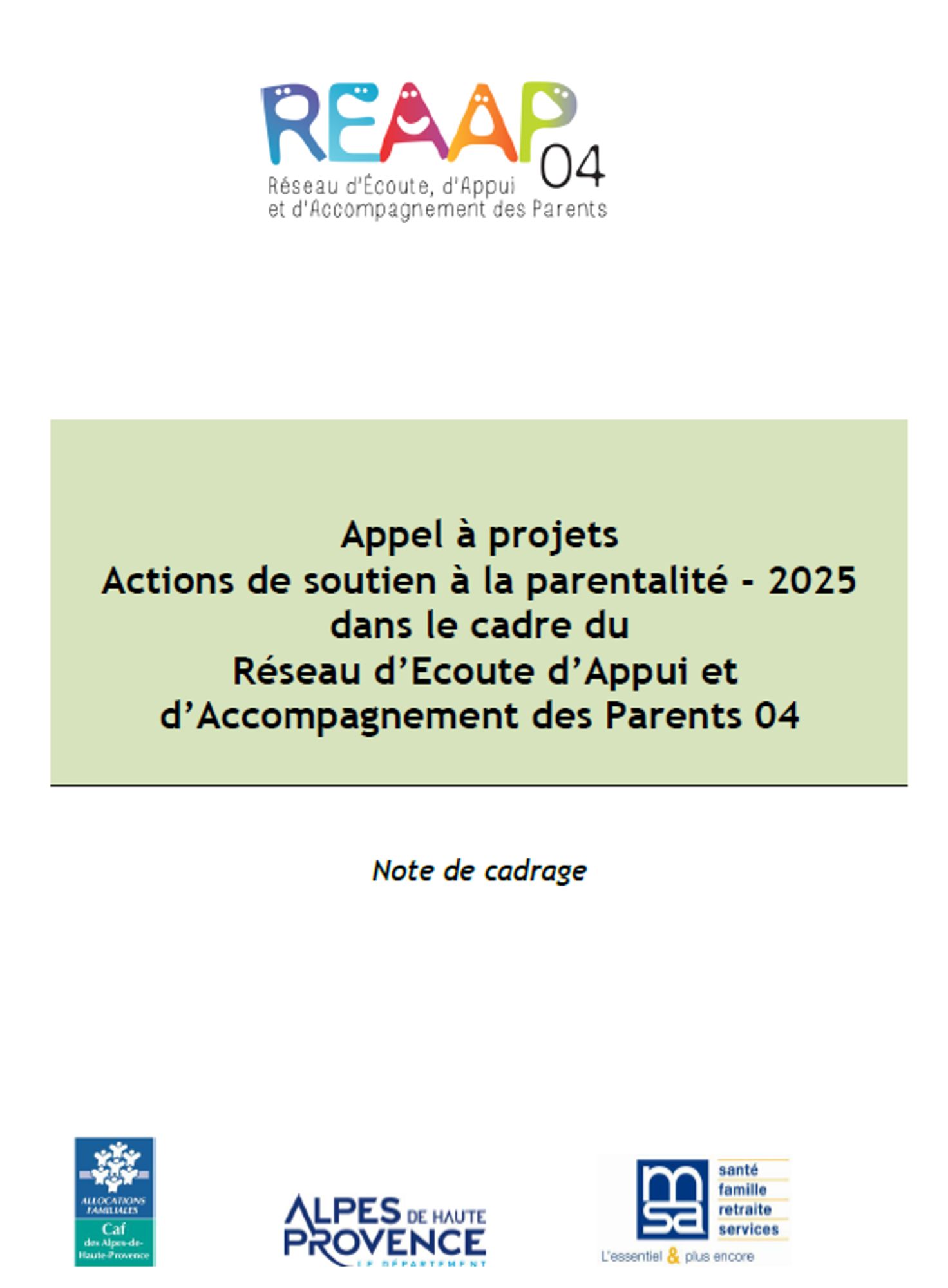 Afin de soutenir financièrement les projets et initiatives qui répondent aux préoccupations des parents, la CAF 04, le DEPARTEMENT 04 et la MSA Alpes Vaucluse renouvellent pour l’année 2025 l’appel à projets REAAP sur le département des Alpes-Haute-Provence.