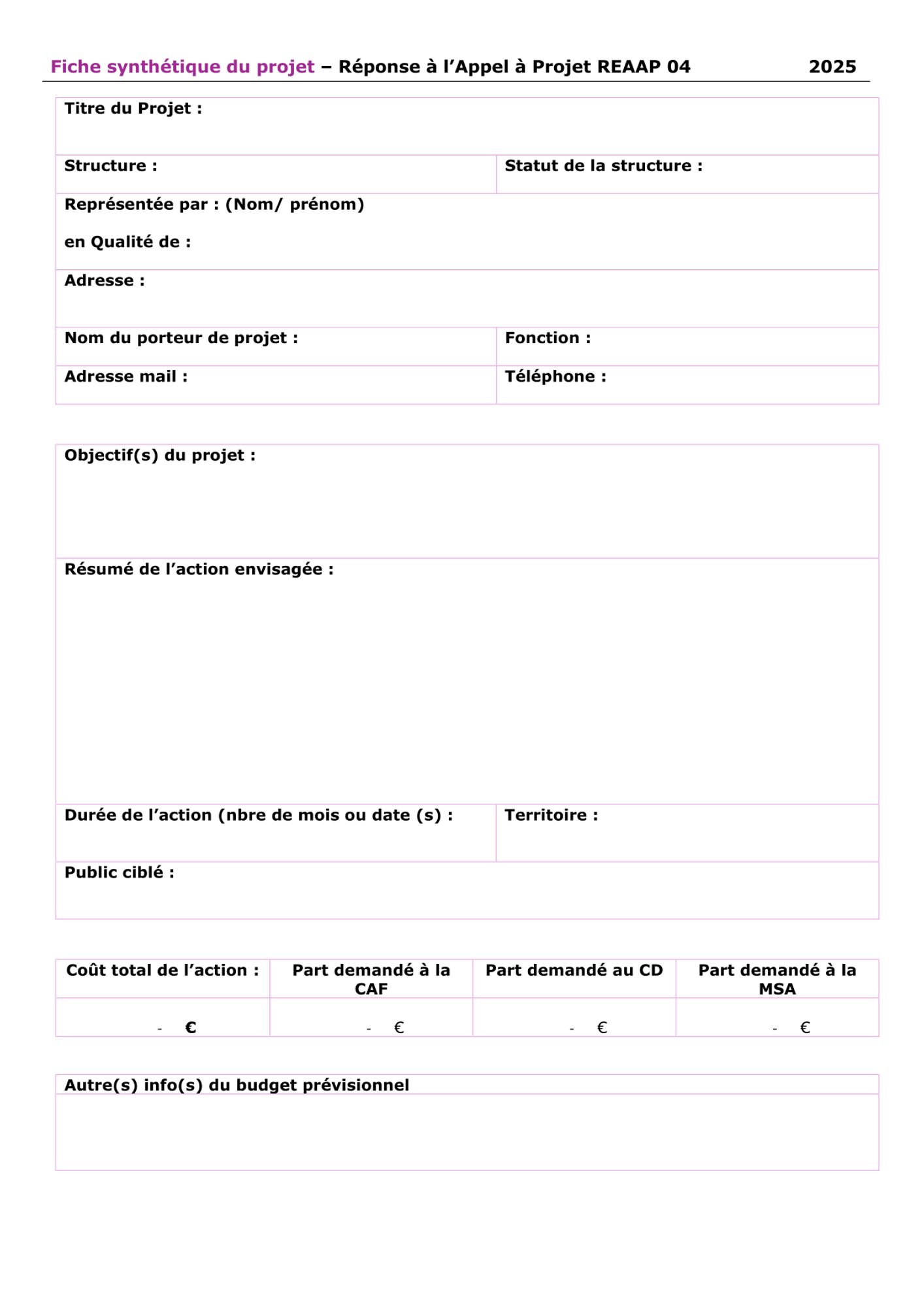 Vous trouvez l'appel à projets REAAP 04 année 2025 ainsi que la fiche synthétique.