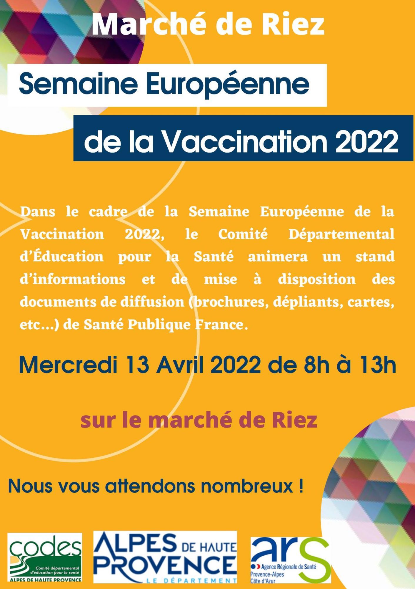Semaine Européenne de la Vaccination - Marché de Riez Dernière modification : 12 avril 2022 Nous vous attendons nombreux !
