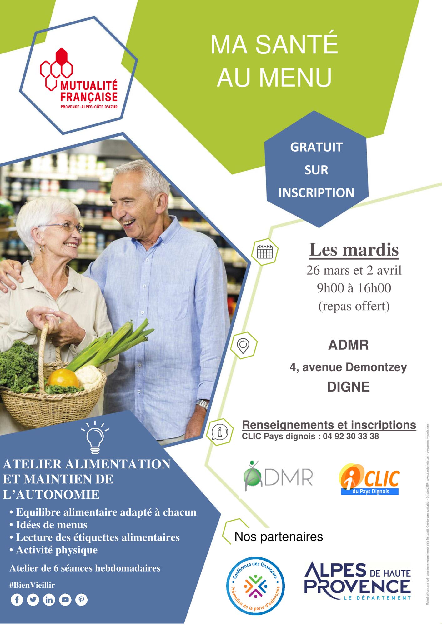 MA SANTE AU MENU Les mardis 26 mars et 2 avril 2024 - ADMR de Digne les Bains de 9h à 16h Renseignements et inscriptions : CLIC Pays Dignois : 04 92 30 33 38 AFFICHE MA SANTE AU MENU DIGNE.pdf (608.8 Ko)