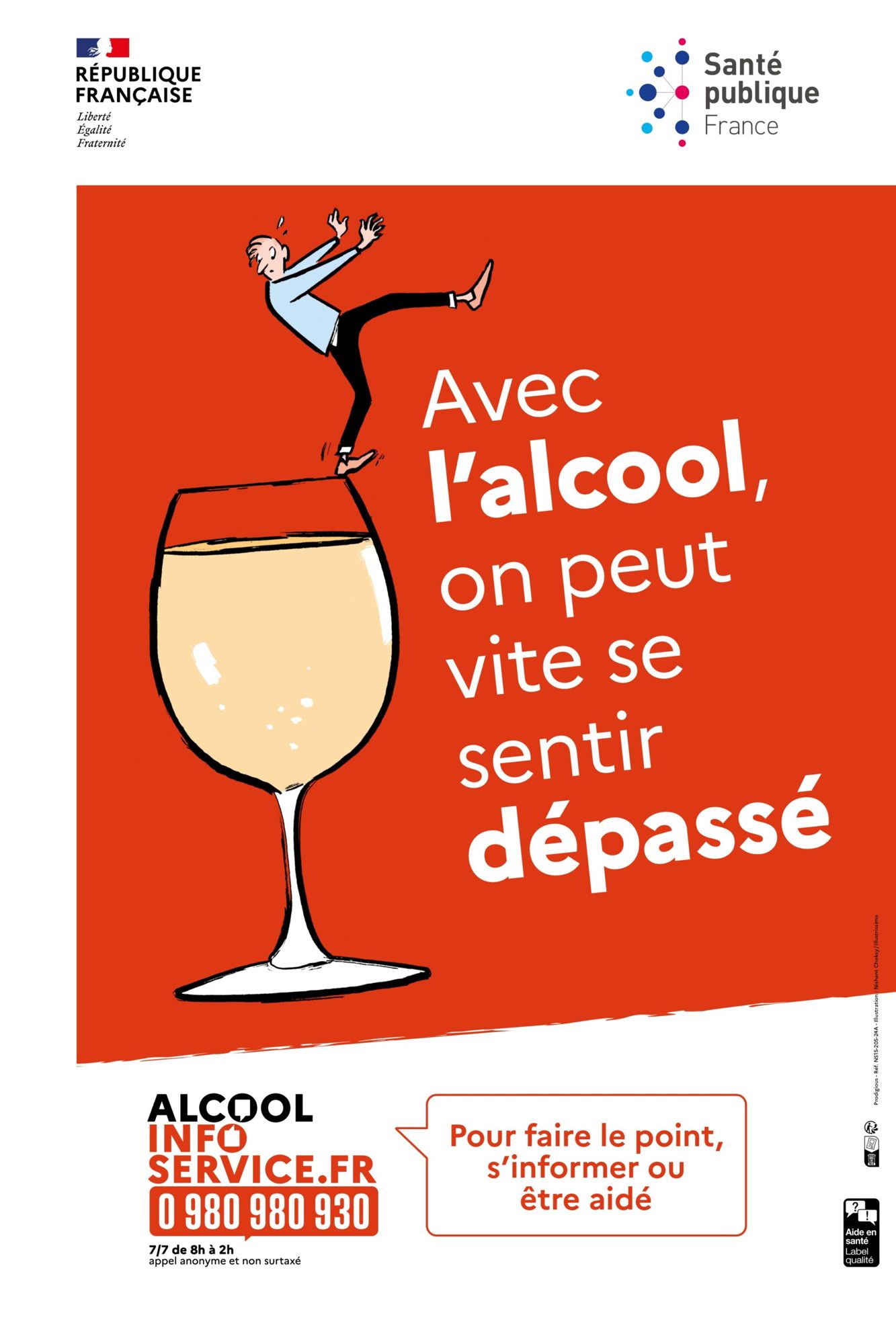 Avec l'alcool, on peut vite se sentir dépassé Santé Publique France Affiche illustrée au format faisant la promotion du dispositif d'aide à distance en santé Alcool info service. 30 x 40 cm Année : 2024