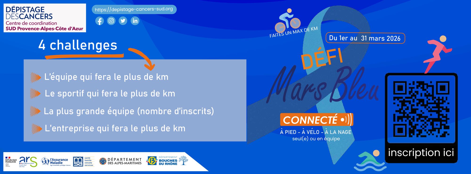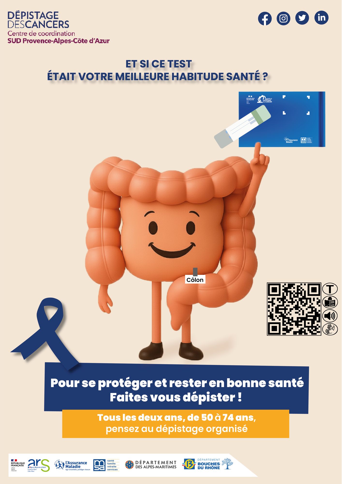 « Mars Bleu » est le mois de la mobilisation contre le cancer colorectal. L'opération vise à sensibiliser la population et les professionnels de santé à l’importance du dépistage, aux outils de diagnostic précoce, mais aussi et surtout de prévention. L’enjeu est majeur : en effet, seul un assuré sur 3 participe à ce dépistage, alors que si 65% de la population participait (comme le recommande l’Union Européenne), 5700 cas de cancer colorectal seraient évités et 6600 vies seraient sauvées chaque année en France…