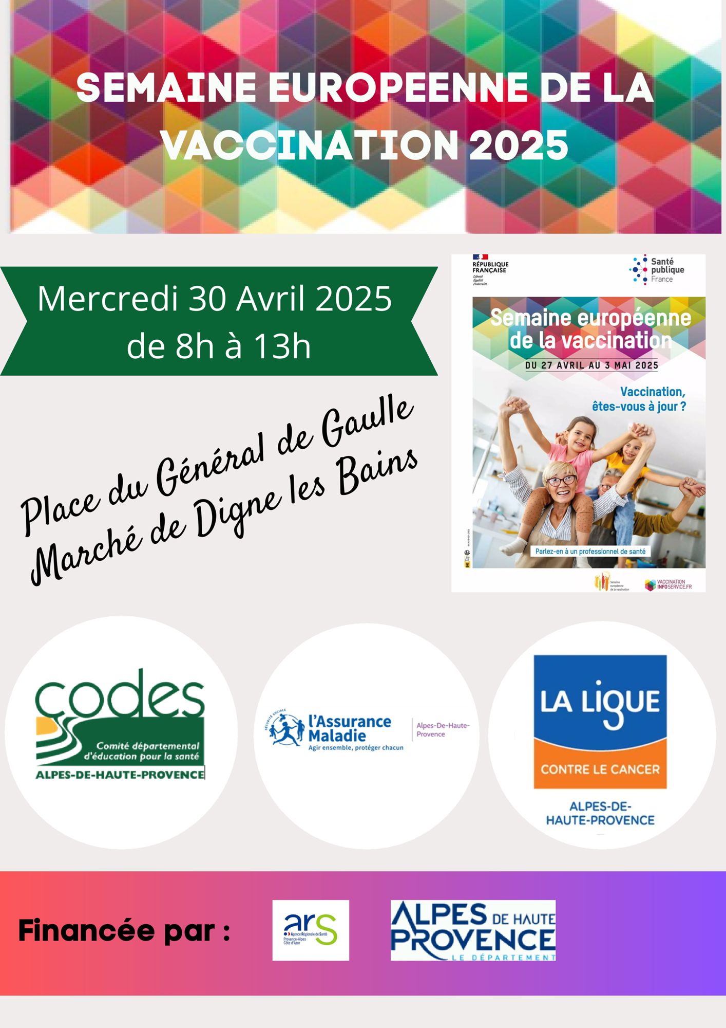 Stand d'information, de diffusion de documents de prévention Mercredi 30 Avril 2025 sur le marché de Digne les Bains.