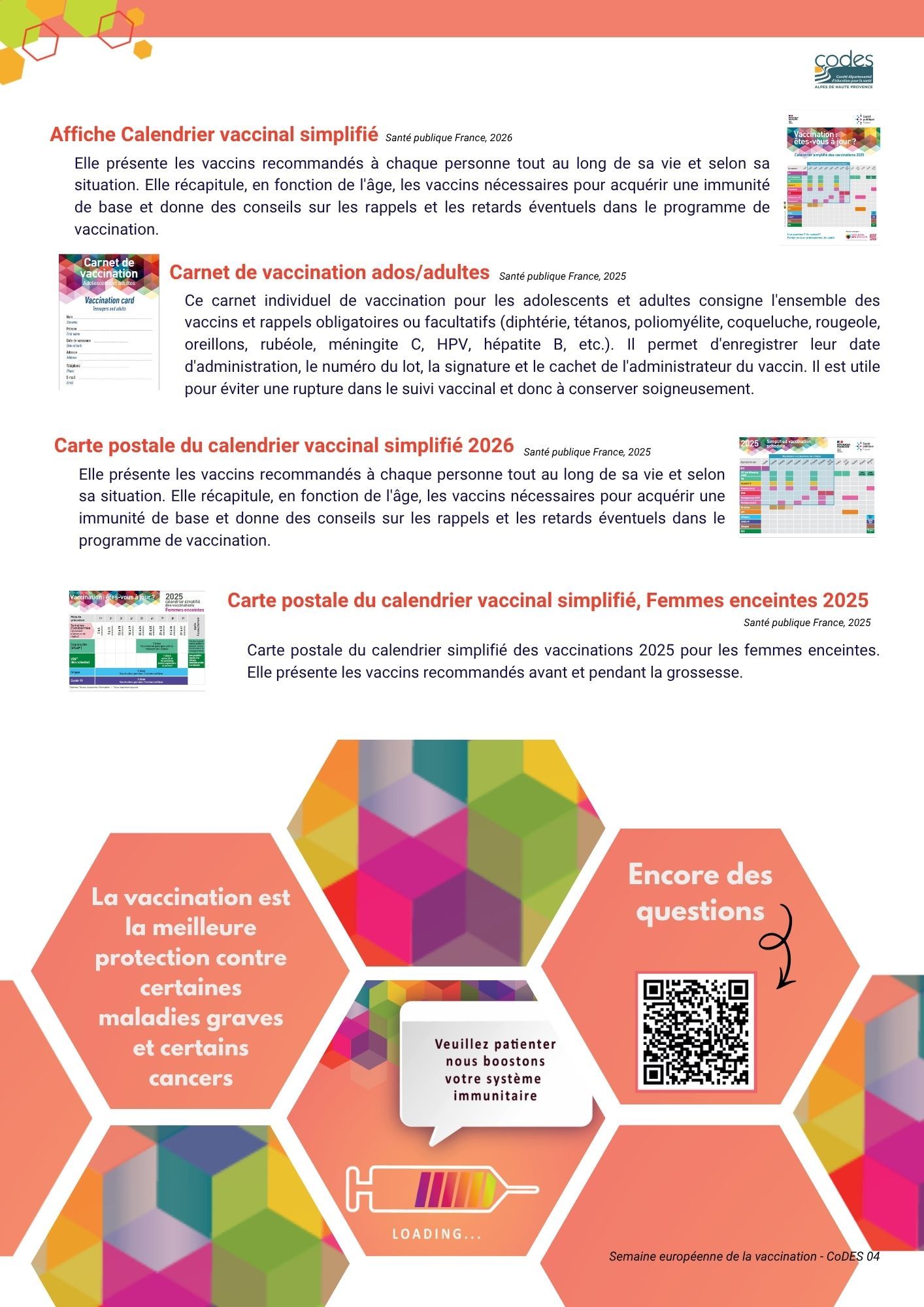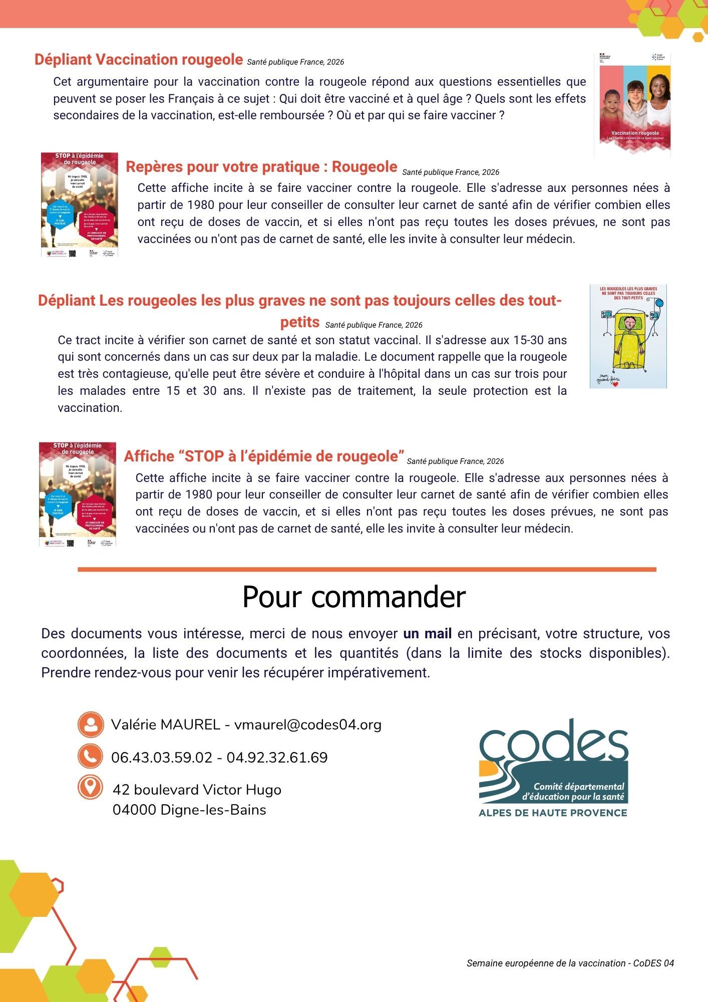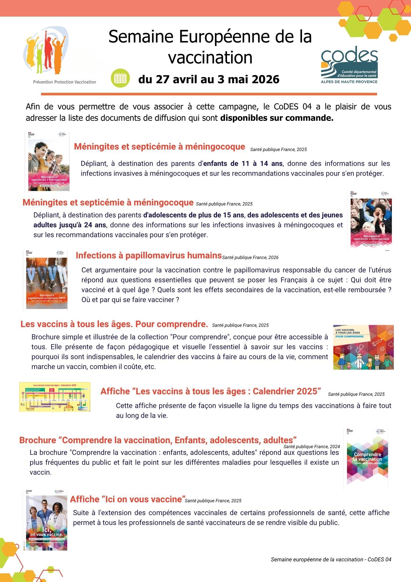 Afin de vous permettre de vous associer à cette campagne, le Co.D.E.S. 04 a le plaisir de vous adresser la liste des documents de diffusion qui sont disponibles sur commande (dans la limite des stocks disponibles) auprès du Centre de Ressources Documentaires du CoDES 04. Ces documents sont utilisables tout au long de l’année.