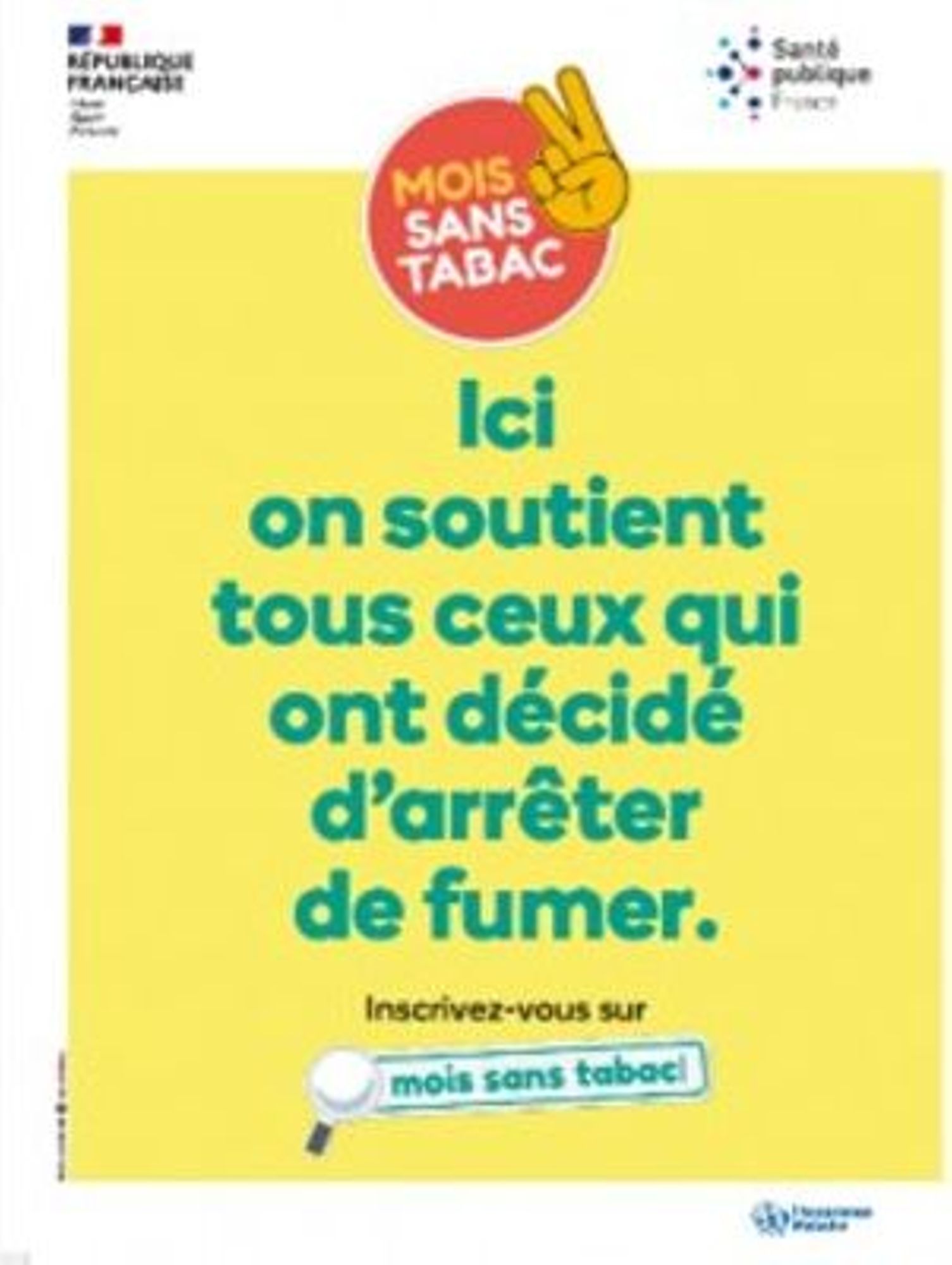 Ici on soutient tous ceux qui ont décidé d'arrêter de fumer. Affiche - Santé Publique France Affiche « Ici on soutient tous ceux qui ont décidé d'arrêter de fumer. » Collation 60 x 80 cm Type de document Affiche Public Tout public Thème Tabac