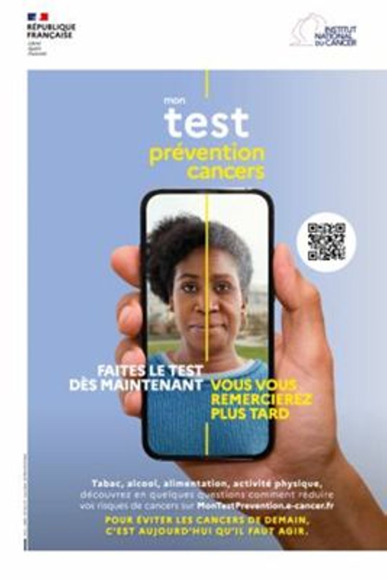 Mon test prévention cancers - Femme Institut National du Cancer Affiche d'information sur Mon test prévention cancers. Un test qui permet de découvrir, en quelques questions, comment réduire ses risques de cancers. Pour éviter les cancers de demain, c'est aujourd'hui qu'il faut agir. 40x60 cm Année : 2024