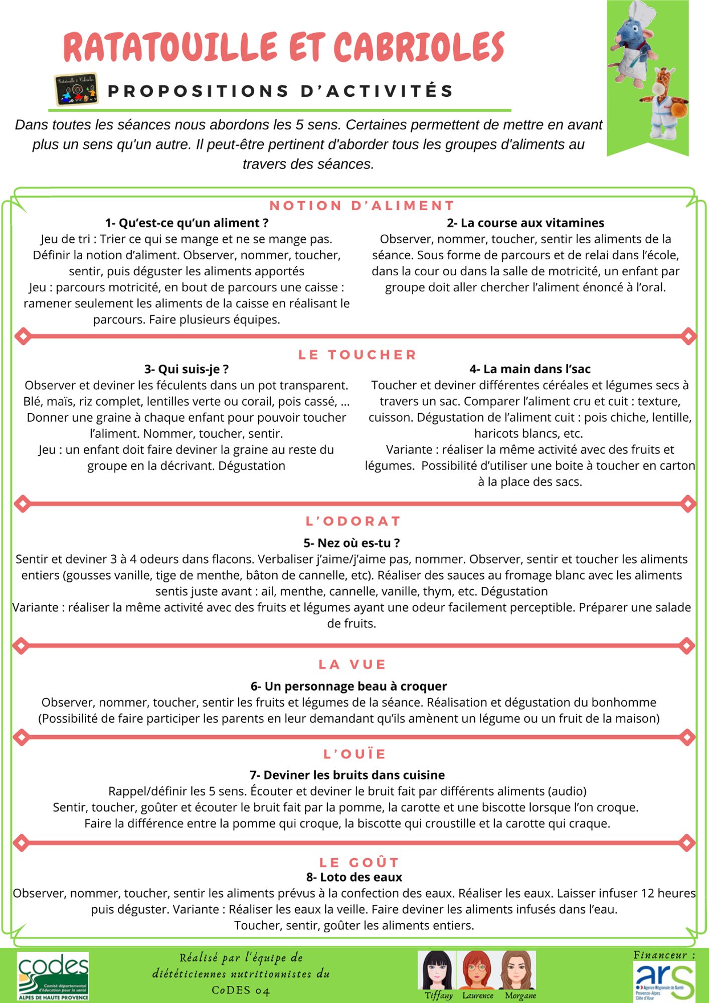 Vous trouverez dans ce dossier les 21 fiches activités ainsi que des fiches annexes numérotées de 1 à 17 qui pourront vous aider dans la mise en place d'activités sur le thème de la nutrition et/ou vous donner des idées pour en créer de nouvelles.