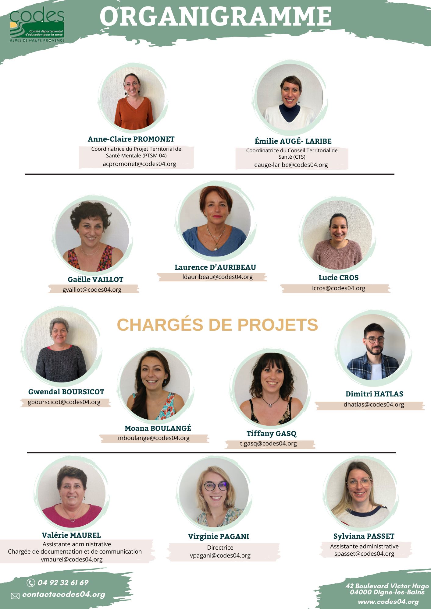 - Chargé.e.s de projets / Educateur.trice.s de santé : Laurence D’AURIBEAU, Gaëlle VAILLOT, Tiffany GASQ, Moana BOULANGE, Dimitri HATLAS, Gwendal BOURSICOT et Lucie CROS