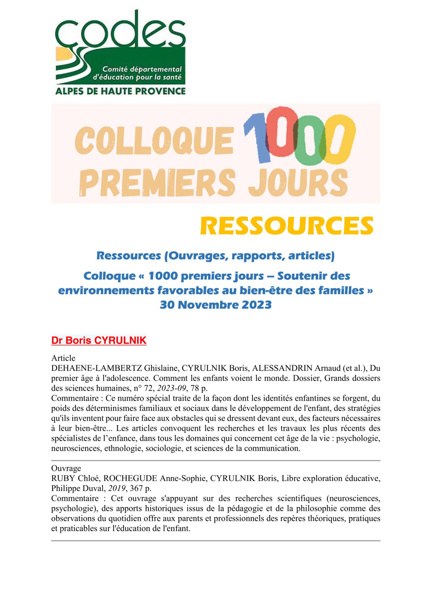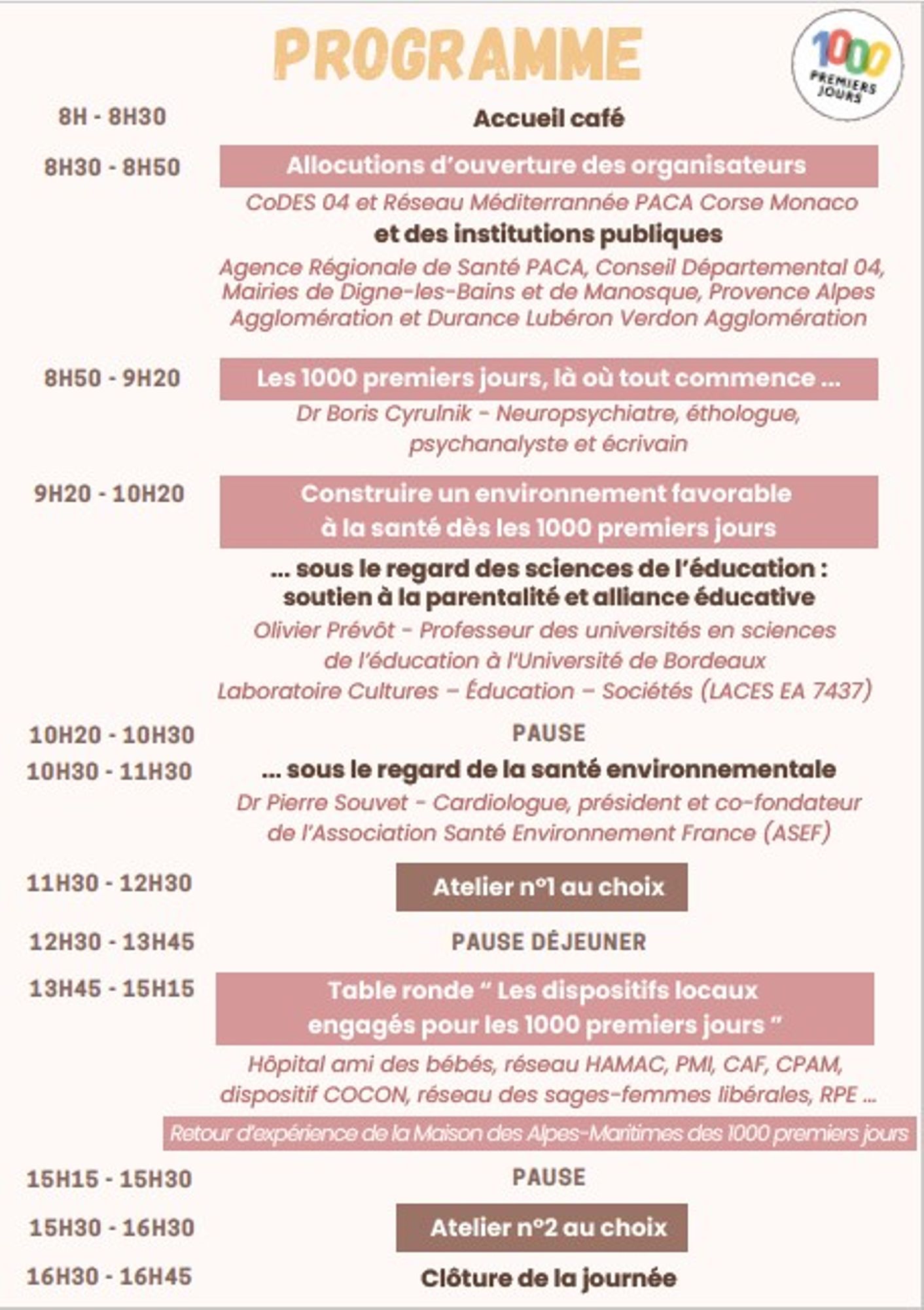 Nous débuterons ce 30 novembre avec l’intervention de B. Cyrulnik qui laissera la place à nos experts en sciences de l’éducation et en santé environnementale. Ces derniers nous inviteront à comprendre et échanger sur différents contextes environnementaux ayant fait leur preuve sur la santé des familles.