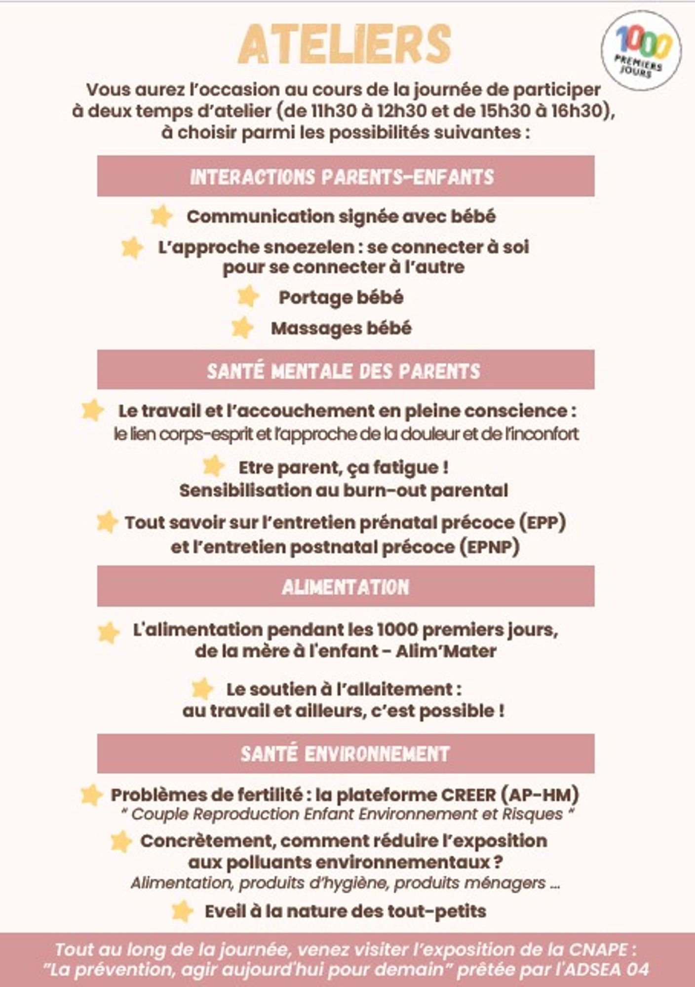 En alternance de ces temps en plénière, des ateliers vous seront proposés. Nous vous invitons d'ailleurs à en choisir les thématiques lors votre inscription.