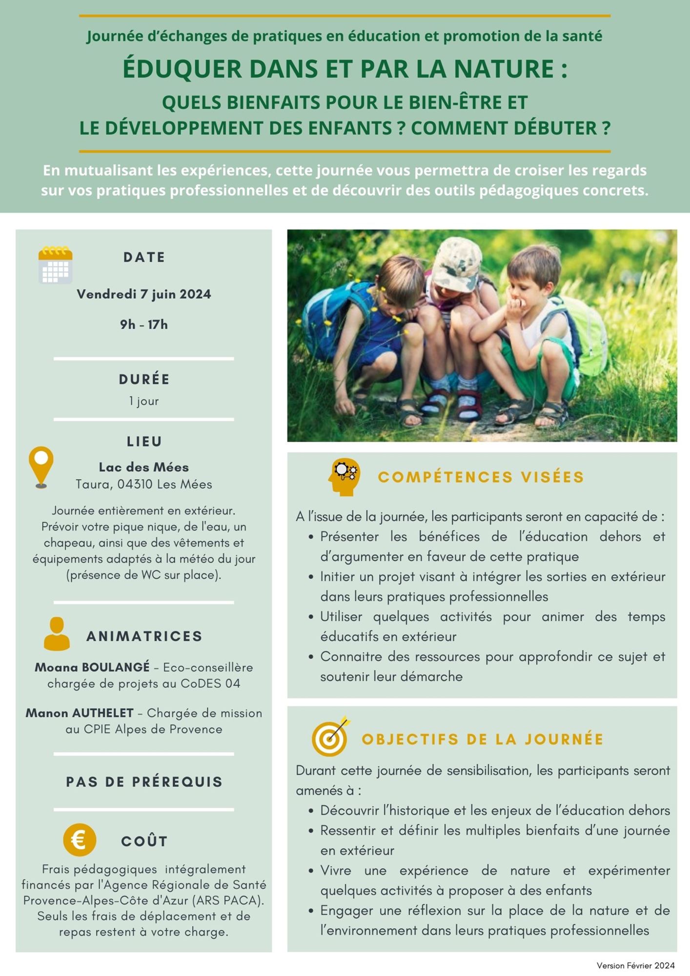 - Réflexions collectives : les leviers/freins pour emmener les enfants dehors, préparer au mieux sa sortie, gestion des risques, communiquer auprès des parents/ de son institution ...