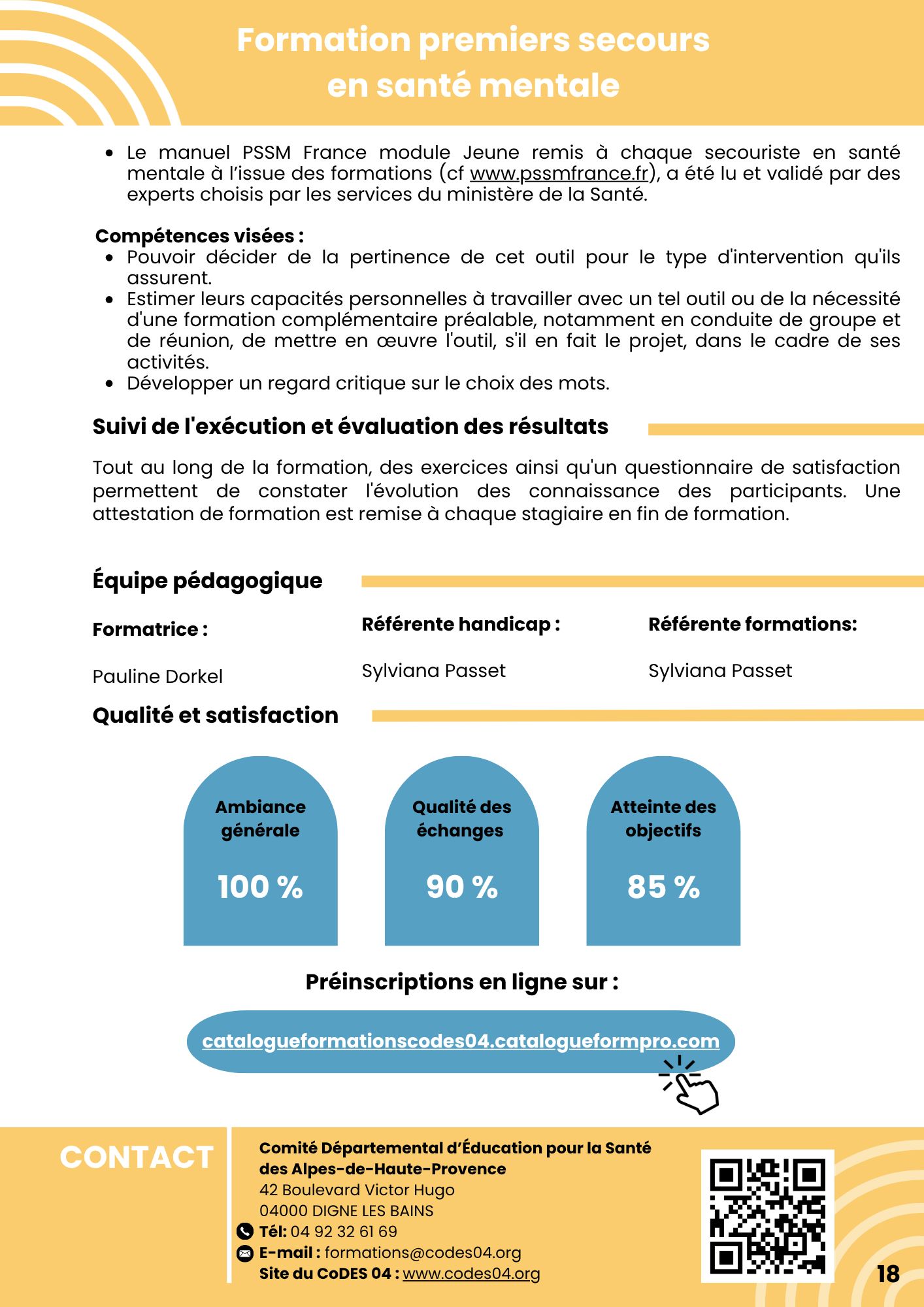 Formation premiers secours en santé mentale 8 et 9 avril 2026 - Place du Tampinet 04000 Digne les Bains S'inscrire en ligne : Contact :CoDES 0442 Boulevard Victor Hugo04000 DIGNE LES BAINS 04 92 32 61 69 formations@codes04.org