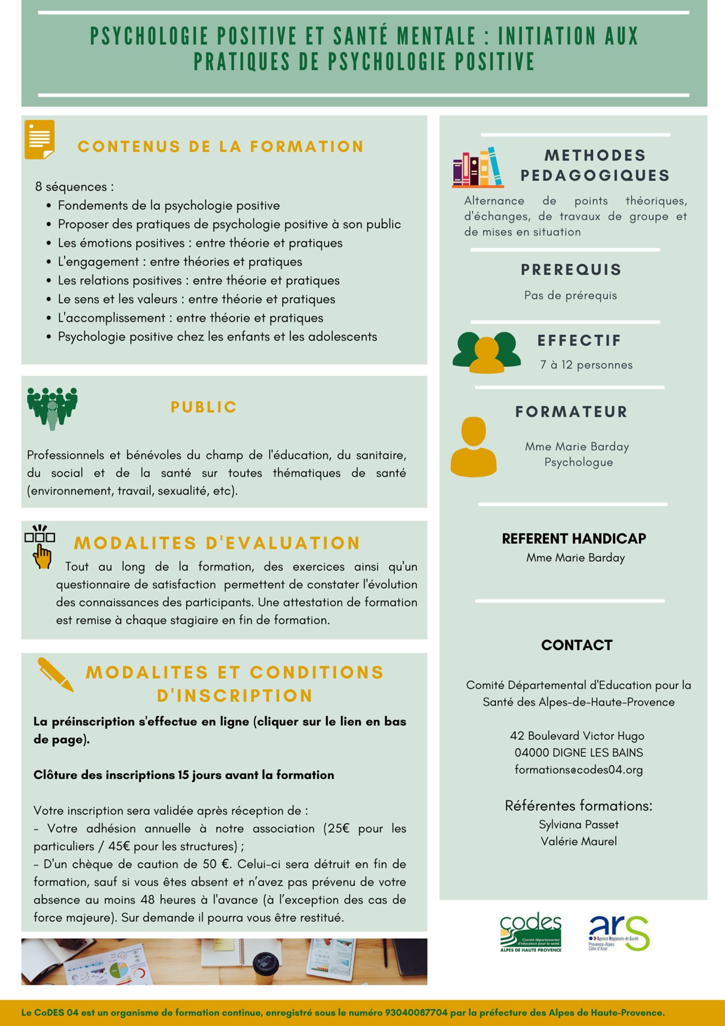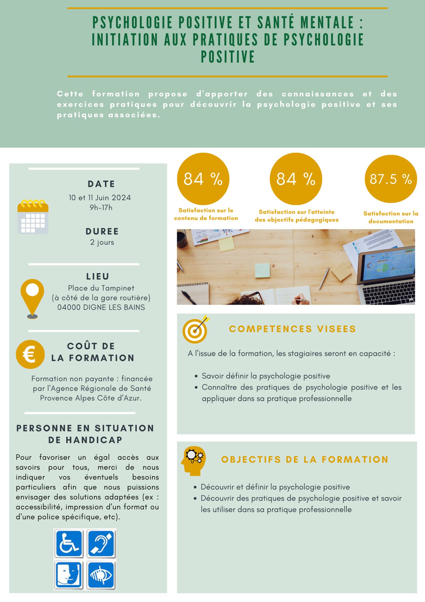- Connaître des pratiques de psychologie positive et les appliquer dans sa pratique professionnelle