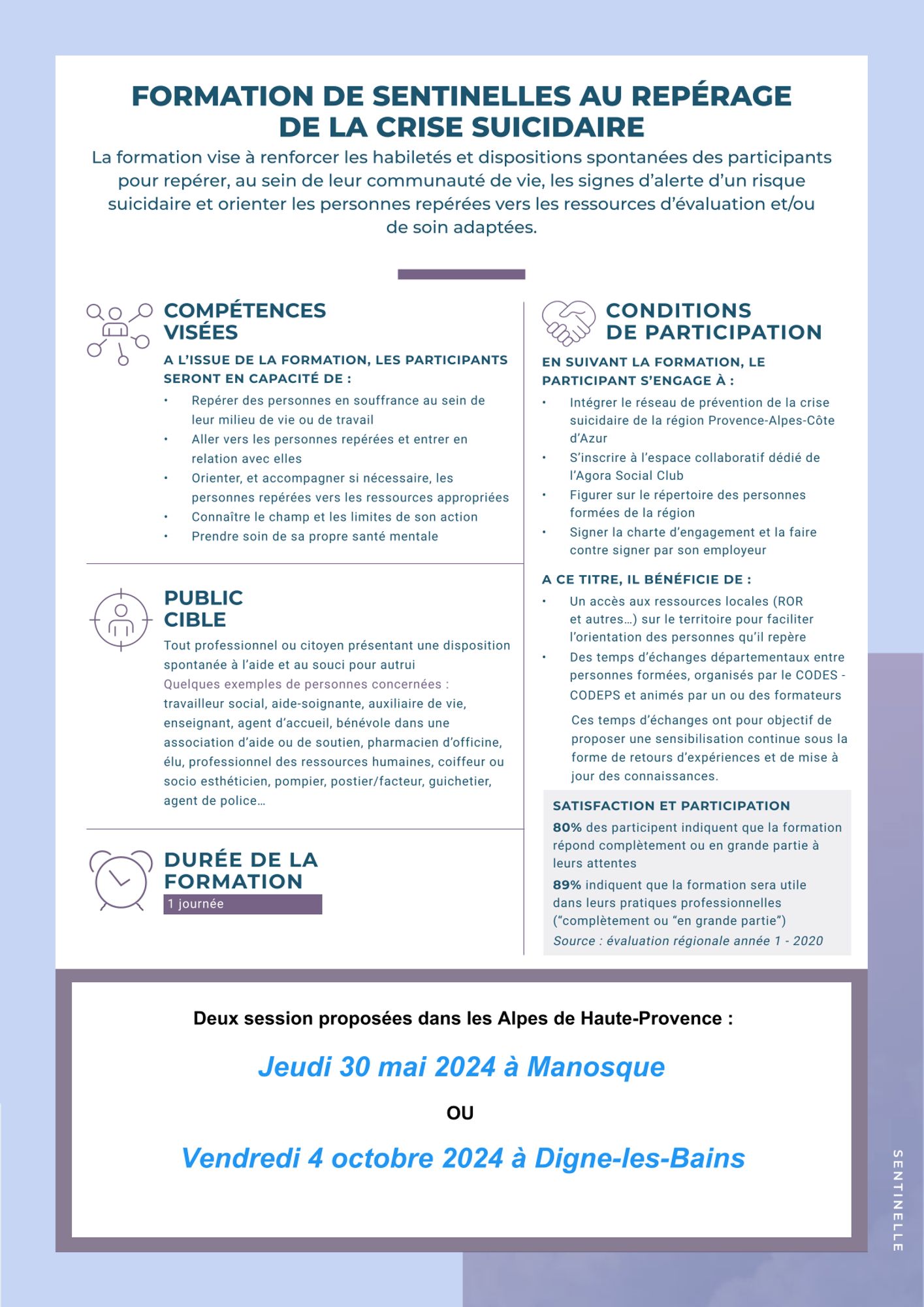 L’objectif de ces formations est l’amélioration du repérage et de la prise en charge des personnes en crise suicidaire par la création d’un réseau en adaptant le contenu de la formation aux rôles, compétences et responsabilités des différents intervenants à chacune de ces étapes.