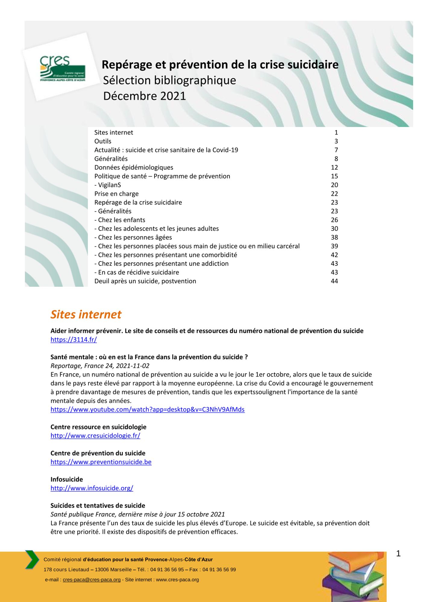 On y trouve des informations d'ordre général sur la prévention de la crise suicidaire pour soi ou pour un proche.