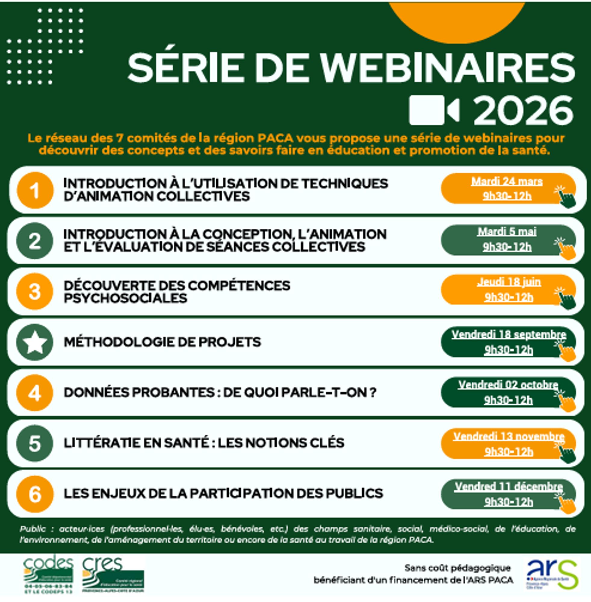 Chaque webinaire se déroule de 9h30 à 12h, sans coût pédagogique, grâce au financement de l’ARS PACA.